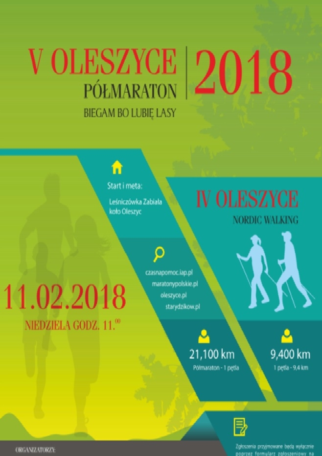 | 09/02/2018 | V Oleszyce Półmaraton | W dniu 11 lutego 2018 r. (niedziela). odbędzie sie V Oleszyce Półmaraton i IV Oleszyce Nordic Walking. Dodatkowo w ramach akcji Biegam Bo Lubię Lasy utworzna jest kategoria "Leśnicy".