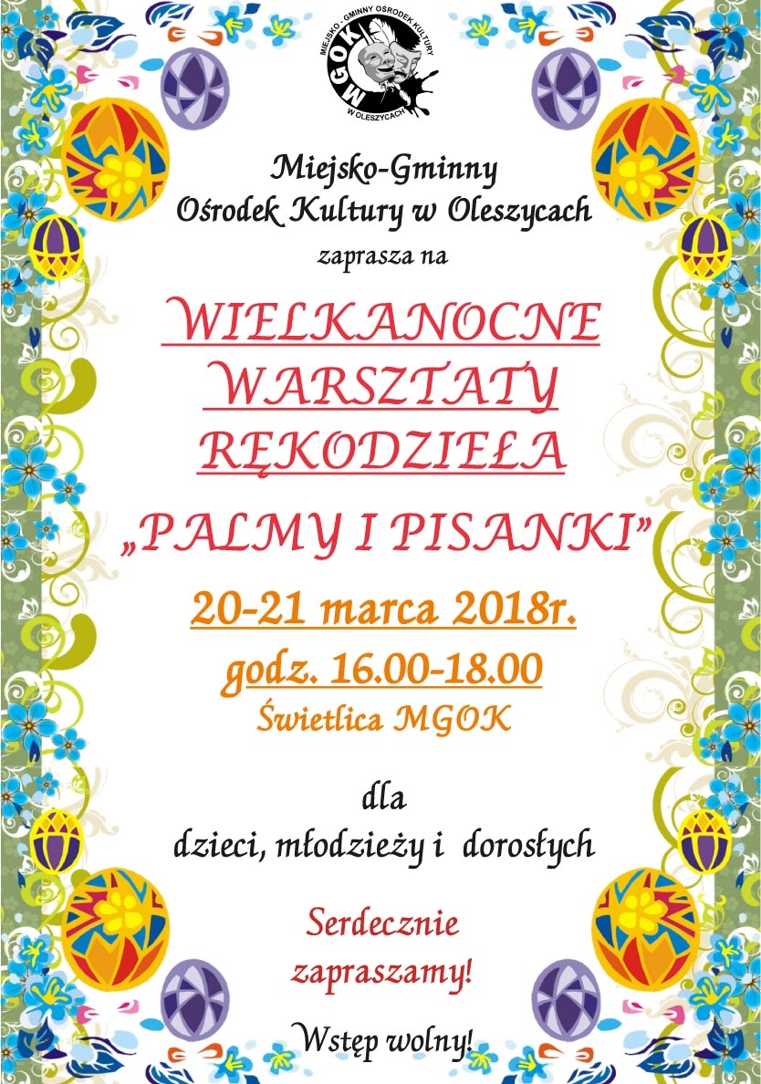 W dniach 20-21 marca odbędą się Wielkanocne Warsztaty Rękodzieła "Palmy i pisanki" dla dorosłych, dzieci i młodzieży. Warsztaty odbywać się będą w świetlicy Miejsko- Gminnego Ośrodka Kultury w Ole...