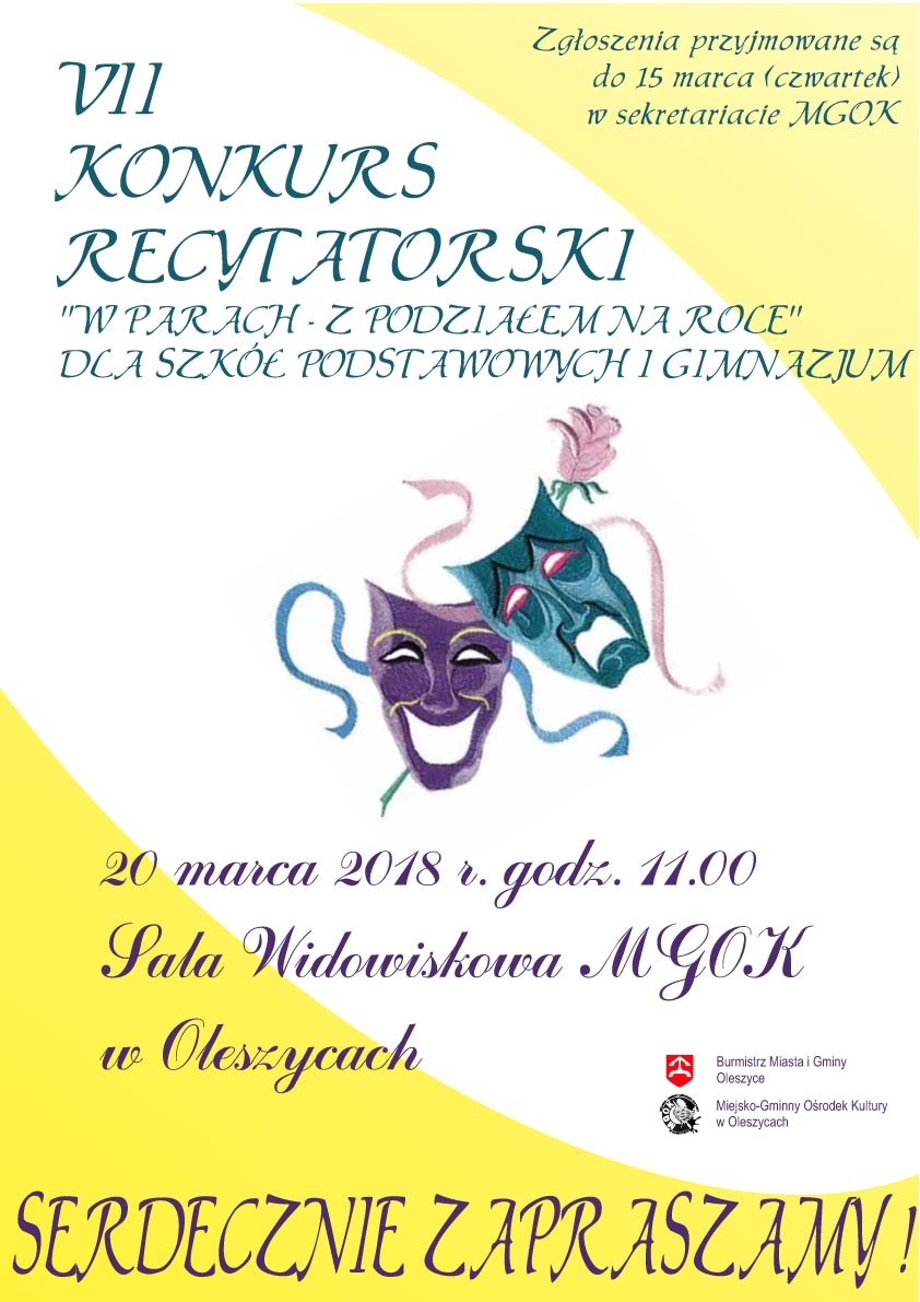 Miejsko – Gminny Ośrodek Kultury w Oleszycach serdecznie zaprasza do wzięcia udziału w VII gminnym konkursie recytatorskim z podziałem na role (w parach) dla uczniów szkół podstawowy...
