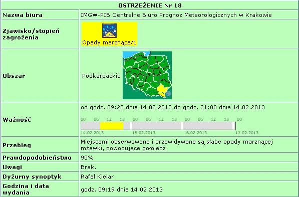 Od godz. 09:20 dnia 14.02.2013 do godz. 21:00 dnia 14.02.2013 miejscami obserwowane i przewidywane są słabe opady marznącej mżawki, powodujące gołoledź.