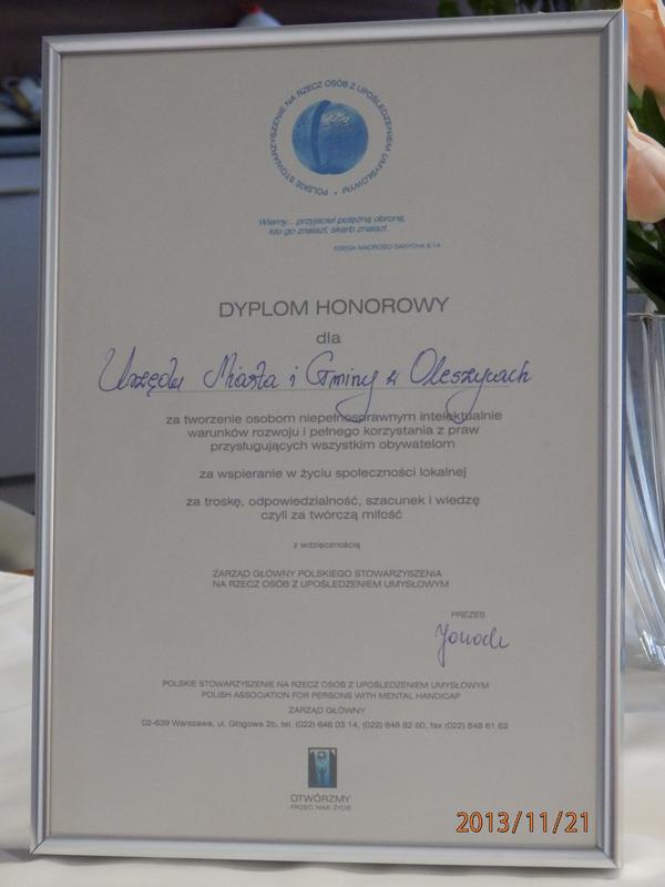 20 listopada odbyła się uroczysta gala z okazji 30-lecia Polskiego Stowarzyszenia Na Rzecz Osób z Upośledzeniem Umysłowym Koło w Jarosławiu. W uroczystości uczestniczył burmistrz Miasta i Gminy Oleszyce Andrzej Gryniewicz, który odebrał dyplom honorowy wraz z „Kulą Doskonałości” za „tworzenie osobom niepełnosprawnym intelektualnie warunków rozwoju i pełnego korzystania z praw przysługujących wszystkim obywatelom, za wspieranie w życiu społeczności lokalnej, za troskę, odpowiedzialność, szacunek i wiedzę czyli za twórczą miłość”.