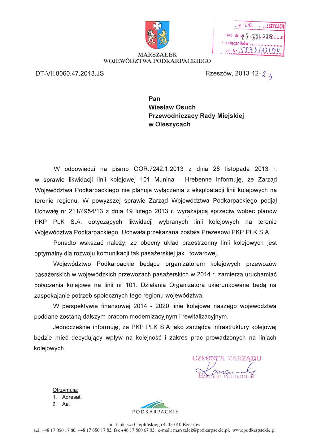 W związku z powyższym, zwracam się do Pana Marszałka, by wspólnie z Marszałkiem województwa Lubelskiego podjęli działania zmierzające do uznania linii kolejowej nr 101 Munina –Werchrata - Hrebenne za nieodzowny element rozwoju i promocji tego zakątka naszego regionu i kraju, oraz niedopuszczenia do jej likwidacji.