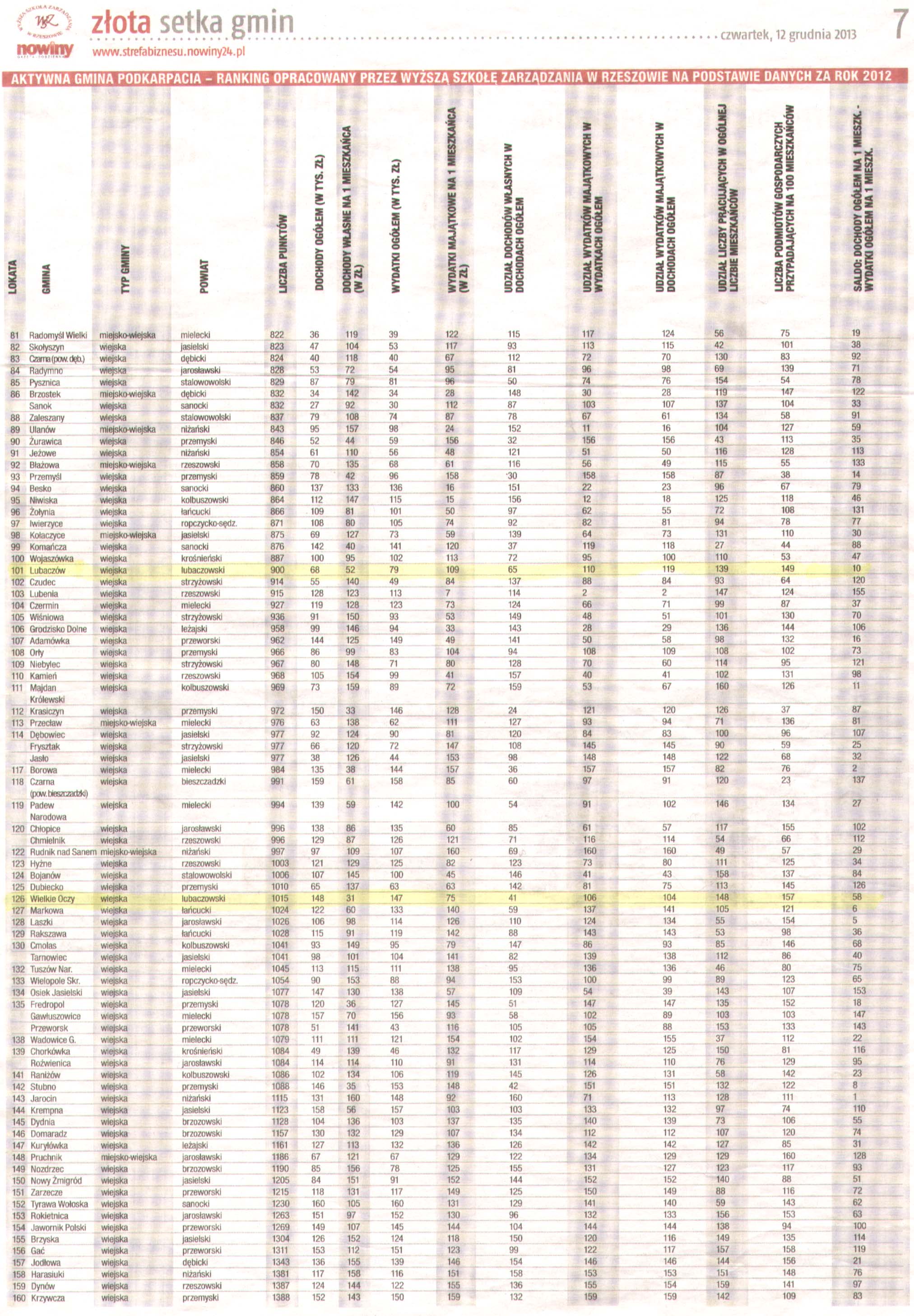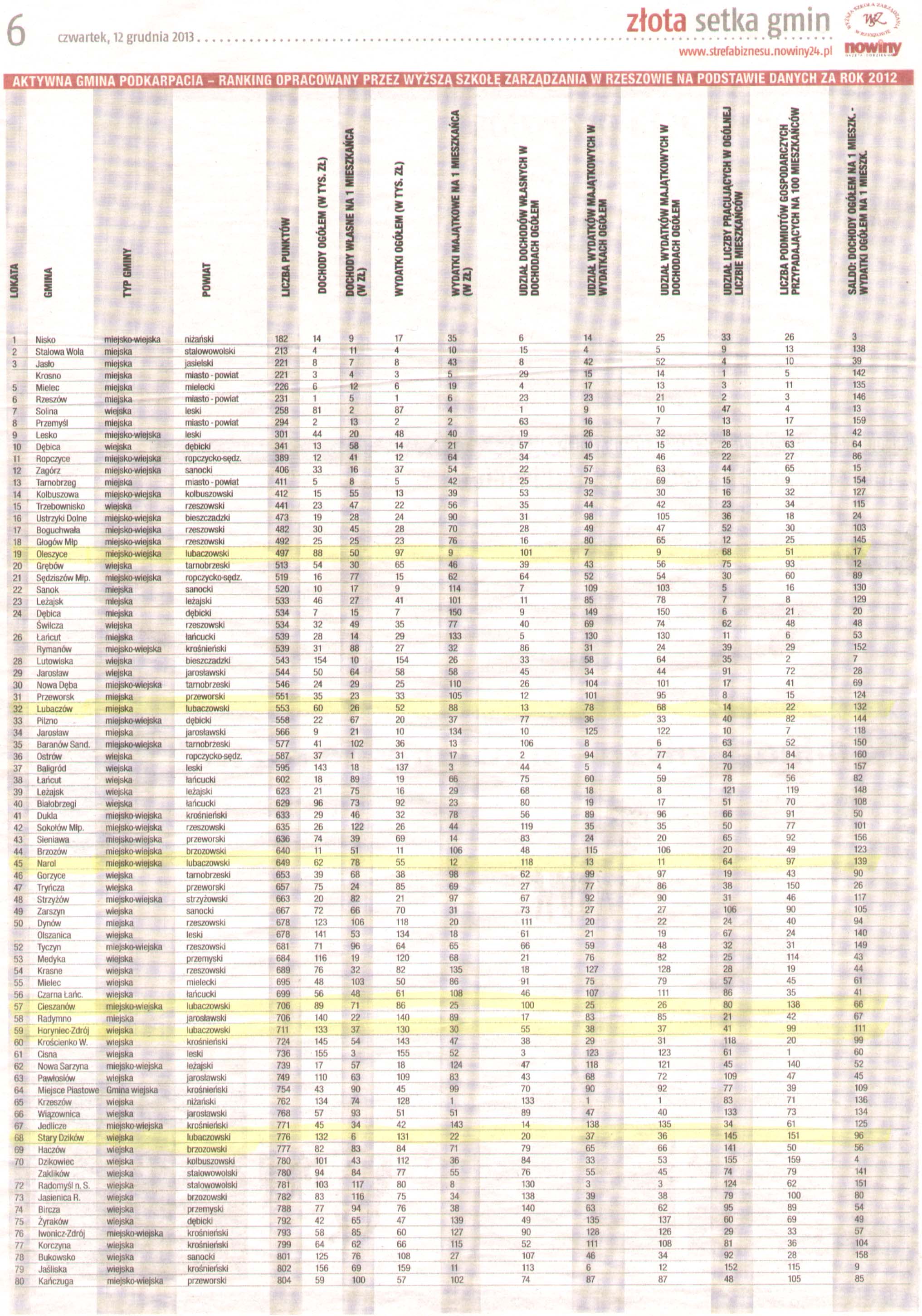 W dniu 12-12-2013 r. w Sali Kolumnowej Urzędu Wojewódzkiego w Rzeszowie już po raz szósty zostały wręczone statuetki i wyróżnienia dla zwycięzców rankingu Złota Setka Gmin Podkarpacia.