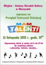 Miejsko-Gminny Ośrodek Kultury w Oleszycach zaprasza na Przegląd Twórczości Dziecięcej "Mam Talent", który odbędzie się 22 listopada 2015r. o godz. 14:00. Na zgłoszenia czekamy do 17 listopada. Więcej informacji na plakacie.