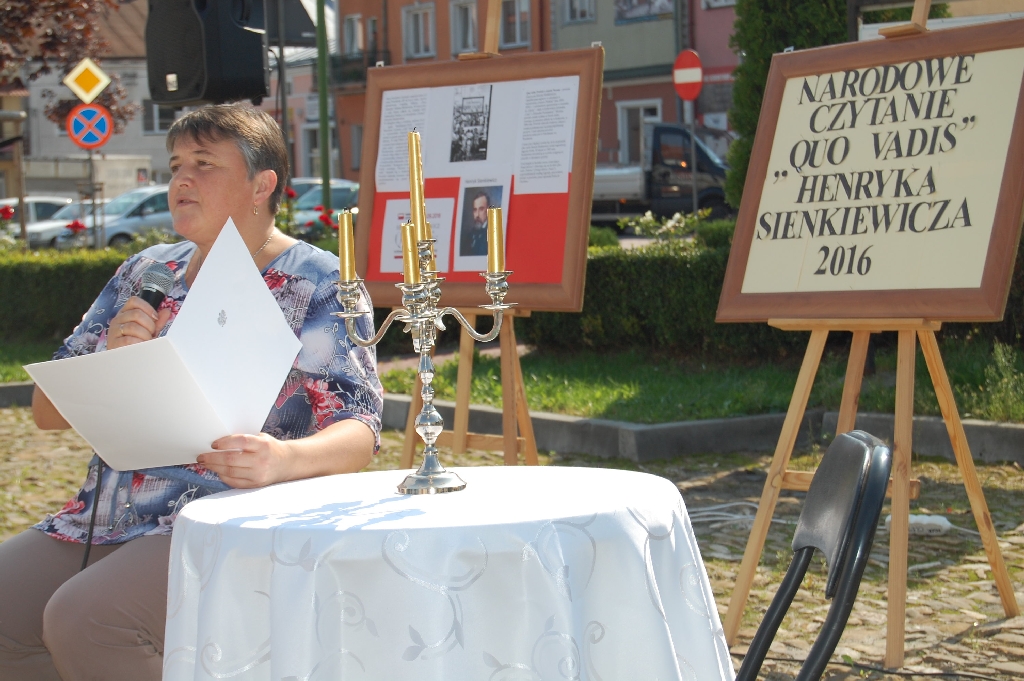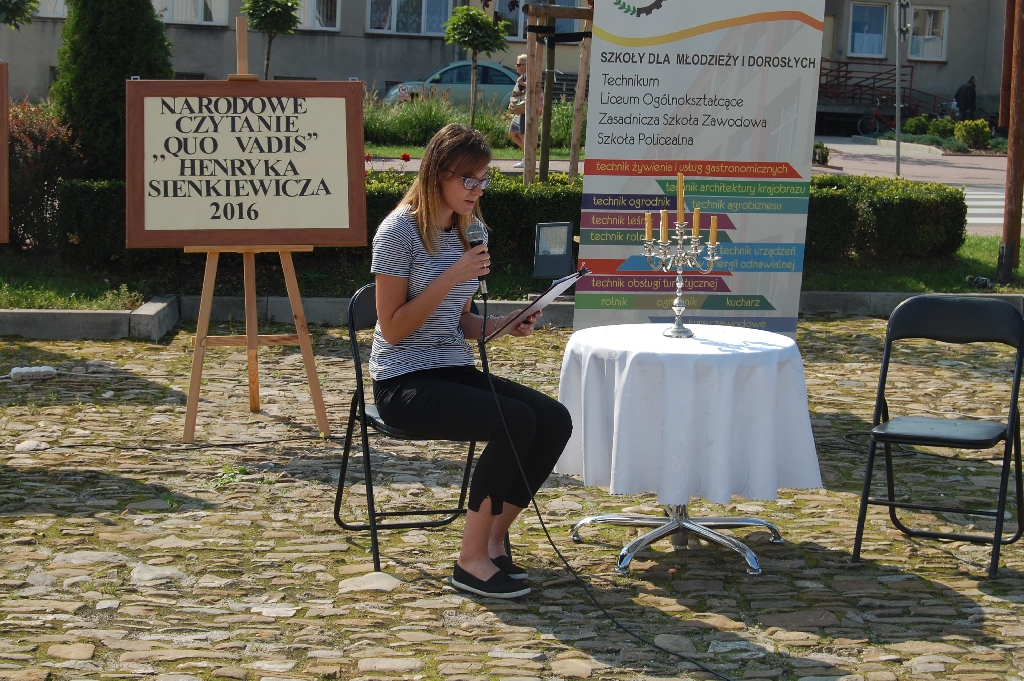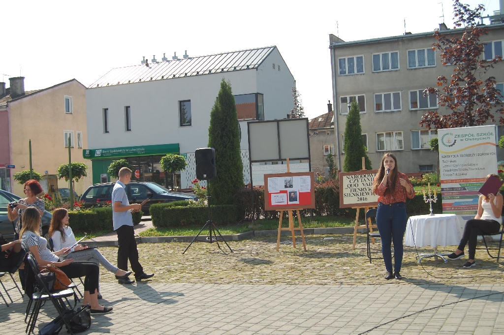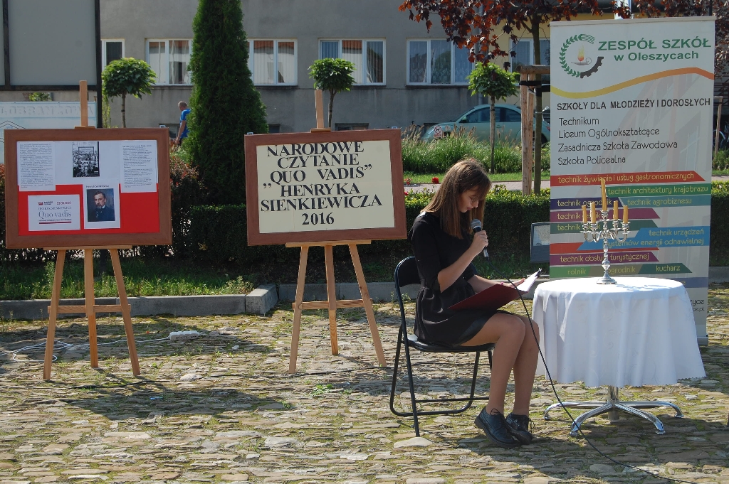 W tym roku czytanie powieści Henryka Sienkiewicza w Zespole Szkół w Oleszycach przybrało szerszy wymiar. Uczniowie aktywnie przyłączyli się do ogólnopolskiej akcji, uczestnicząc w czytaniu. Ciekawą inicjatywą był pomysł zaprezentowania fragmentów powieści społeczności lokalnej 07.09.2016r. na oleszyckim Rynku, gdzie nasi uczniowie: Gabriela Okopnyj, Jarosław Paraszczyn, Agata Dec, Aleksandra Majdan, Dominika Cieśla zaprezentowali fragmenty powieści. W atmosferę słuchaczy wprowadziła Lilija Mastykasz, przypominając znane polskie i angielskie piosenki.