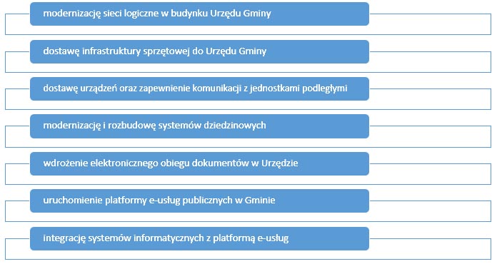 Projekt obejmuje zadania inwestycyjne polegające na modernizacji platformy sprzętowej Urzędu Miasta i Gminy Oleszyce oraz w jednostkach podległych, rozbudowie systemów informatycznych, uruchomieniu platformy e-usług publicznych w Urzędzie.
