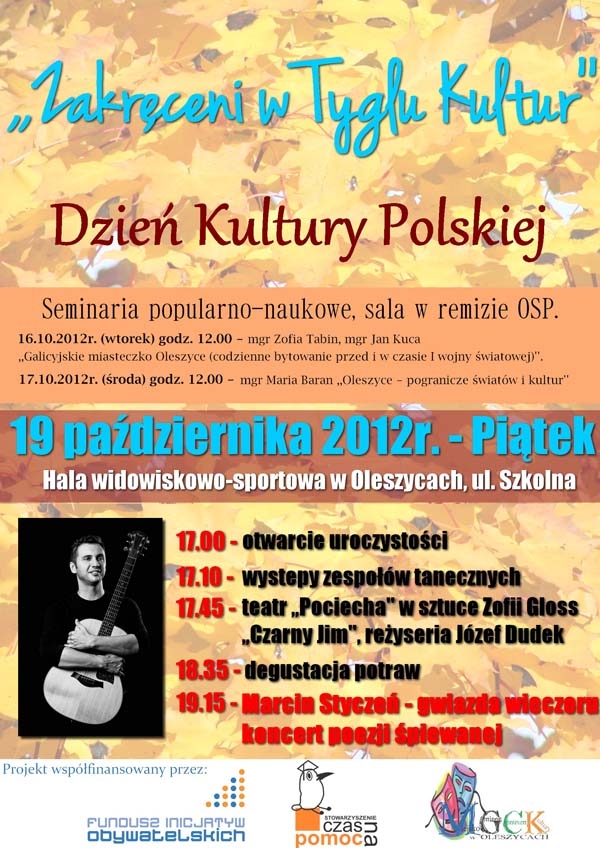 Burmistrz Miasta i Gminy Oleszyce zaprasza na Dzień Kultury Polskiej, który odbędzie się 19 października 2012 r. na hali widowiskowo-sportowej w Oleszycach. Otwarcie uroczystości o godz. 17:00. Więcej informacji na plakacie.
