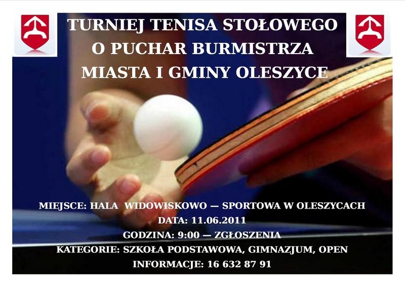 Zapraszamy na Turniej Tenisa Stołowego o Puchar Burmistrza Miasta i Gminy Oleszyce, który odbędzie się 11 czerwca 2011 r. o godz. 9:00 w hali widowiskowo-sportowej w Oleszycach.