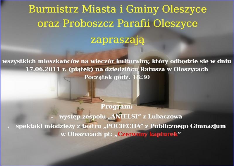 Burmistrz Miasta i Gminy Oleszyce oraz Proboszcz Parafii Oleszyce zapraszają wszystkich mieszkańców na wieczór kulturalny, który odbędzie się w dniu 17.06.2011 r. (piątek) o godz. 18:30 na dziedzińcu Ratusza w Oleszycach.