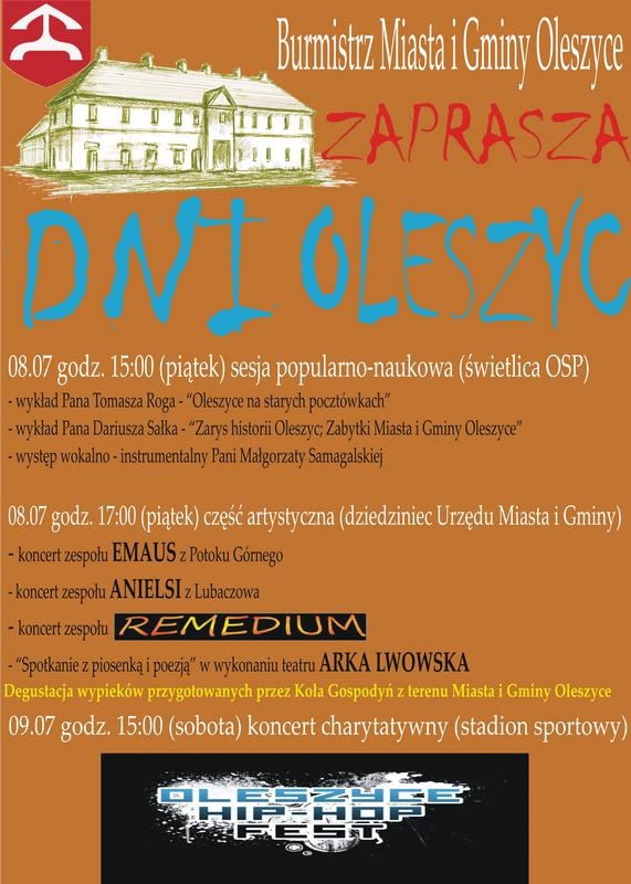 Burmistrz Miasta i Gminy Oleszyce zaprasza na Dni Oleszyc, które odbędą się 8 oraz 9 lipca. 8 lipca o godz. 15:00 - sesja popularno-naukowa w świetlicy OSP, o 17:00 - część artystyczna na dziedzińcu Urzędu Miasta i Gminy. 9 lipca o godz. 15:00 odbędzie się koncert charytatywny na stadionie sportowym. Zapraszamy.